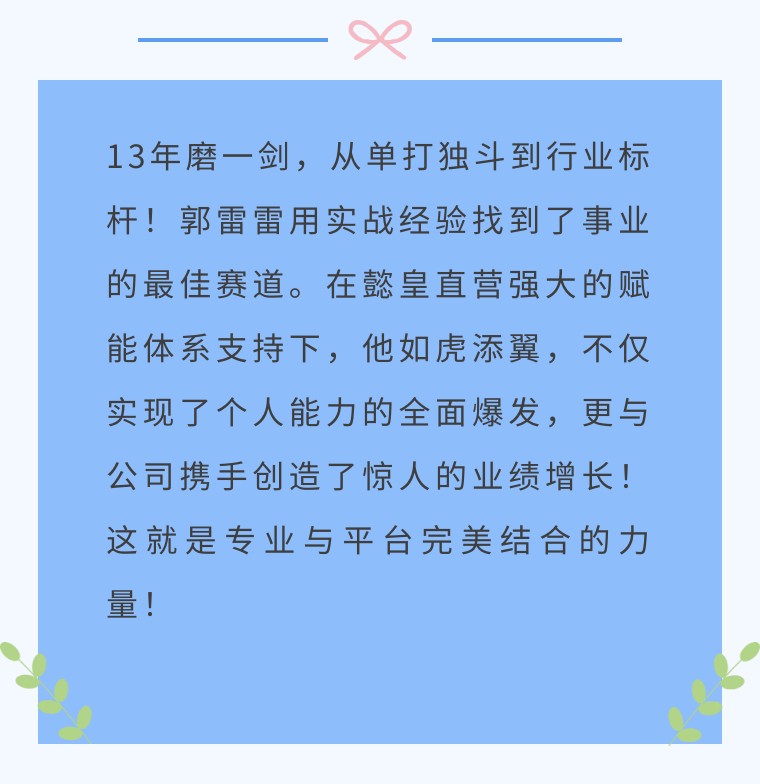 在此,我們也想對(duì)在外奮斗的家人們說(shuō),如果你們也面臨與郭雷雷相似的困擾,那么擁有 20 年深厚底蘊(yùn)、成熟企業(yè)文化與強(qiáng)大支撐賦能體系的懿皇地產(chǎn),定能為你排憂(yōu)解難,成為你事業(yè)騰飛的堅(jiān)實(shí)后盾!